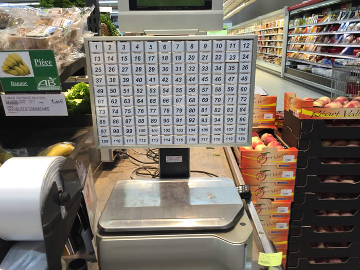 Shopping at the "Super U" in Montrichard. Produce was weighed and priced by pressing the appropriate number on the scale. We went here a few times because the local grocery in Pontlevoy temporarily closed two weeks after we arrived. |