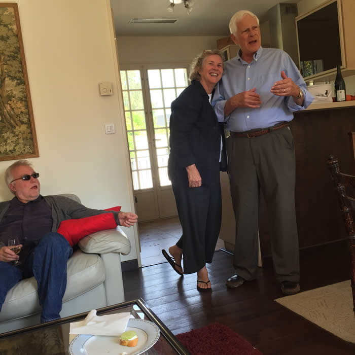 Dr. Morris Marx (former president of UWF) and his wife Sally in thier cottage. Sitting down is Joe Samuelson who taught art history and created his own art inspired by life in the village. Morris is in the middle of telling one of his entertaining stories. The Marx's had weekly gatherings at their cottage for students and faculty and were great companions for us during our time in France. |